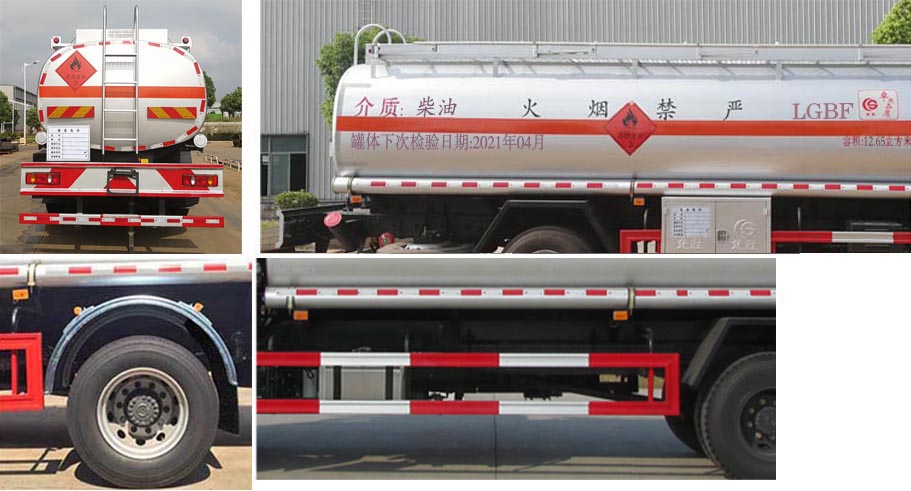 | 配置 | 1、該車適用于危險(xiǎn)品運(yùn)輸,運(yùn)送危險(xiǎn)貨物車輛類型為:FL型,類項(xiàng)號(hào):3。罐體有效容積:12.65立方米,運(yùn)輸介質(zhì):柴油、煤油、汽油,密度:830、800、700千克/立方米,罐體外形尺寸(長×寬×高)(mm):5700×2000×1400。罐體上部選裝上走道;選裝后部尾燈架樣式;選裝弧形擋泥板;選裝左側(cè)無工具箱。加油機(jī)型號(hào)及生產(chǎn)企業(yè):BL1111Z/珠海市貝林加油設(shè)備有限公司中山分公司,HS1812B/托肯恒山科技(廣州)有限公司,SKES-1112/恒和嘉華科技有限公司(上海伯萊機(jī)械有限公司),SK20QF-111A、SK20QF-222A/鄭州三金石油設(shè)備制造有限公司,CS20D1110F/正星科技有限公司,JSK-70B1121CZ,JSK-70B1121C,JSK45B1121C/穩(wěn)恩佳力佳(北京)石油化工設(shè)備有限公司, ZH6444/佛山市眾澤機(jī)電科技有限公司, XTST121BF1/邢臺(tái)正潤通科技發(fā)展有限公司,TA-1111KFJ/沈陽航天新陽機(jī)電有限公司。2、側(cè),后防護(hù)材料均為Q235,螺栓連接;后防護(hù)截面尺寸120×60mm,下邊緣離地高500mm。3、僅采用軸距(mm):4700。隨底盤選裝駕駛室前面罩,選裝側(cè)窗玻璃;駕駛室頂部中間三個(gè)裝飾燈為選裝件;前霧燈為選裝件;駕駛室前臉擾流罩為選裝件。僅選用排氣管前置、限速裝置(限速80km/h)、前輪盤式制動(dòng)及子午線輪胎的底盤;安裝帶有衛(wèi)星定位功能的行駛記錄儀;后軸采用空氣懸架,轉(zhuǎn)向輪安裝輪胎爆胎應(yīng)急防護(hù)裝置。ABS型號(hào)/生產(chǎn)廠家:3631010-C2000/東科克諾爾商用車制動(dòng)系統(tǒng)(十堰)有限公司。 | ||
